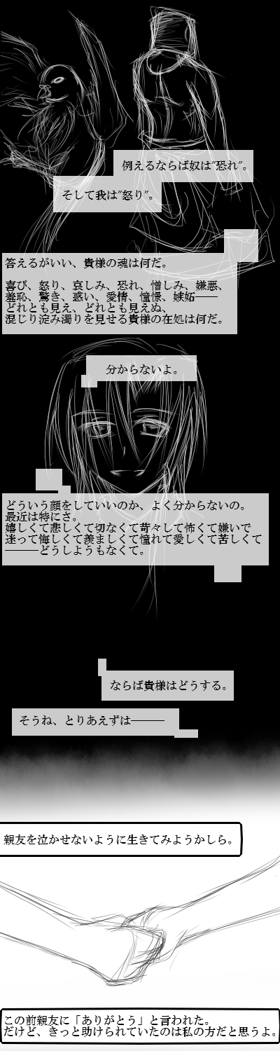 日記にテキトー文章すら入れるの忘れてチキレ敗北な今回です、こんばんは。 最近更新が早めに来るのが嬉しくもあり同時にちょっと悔s―― そんな事より雑記メモめも。 ■練習試合と闘技大会 共通項はフルボッコ、どっちも酷過ぎて笑うしかありませんでしたァーッ!! 防具更新で少しは改善されるんでしょうかねえ… いや火霊の訓練で更に無属性弱点が加速してるのは理解してるんですけれど。 ■メッセ関係 一部メッセに加えてコミュニティの方も全滅しました、用事がある時は予めやっておかないと無理ー、と。 …泊まり掛けで2日程郊外へ、ってのは意外と作業進行に影響出ますね、以後注意。 ■絵日記 そんな感じでハプニングというか放送事故続きだったので、描写したかった部分を絵日記にて。 ≪イベントが進行しました。≫ とかそんな感じ。 ごく普通の一般人が真に想うのは、やはりごく日常の言葉に込められた想いのコトバ。 絵日記をUPした後に知人数名からメッセンジャーで 「俺の眼から汗が/塩水が/体液が」 とか そんな言葉を頂きましたが…… 感動話とは違う気がしますよ、あるぇー? あ、親友さん微妙に借りましたっ!(ここで言うな